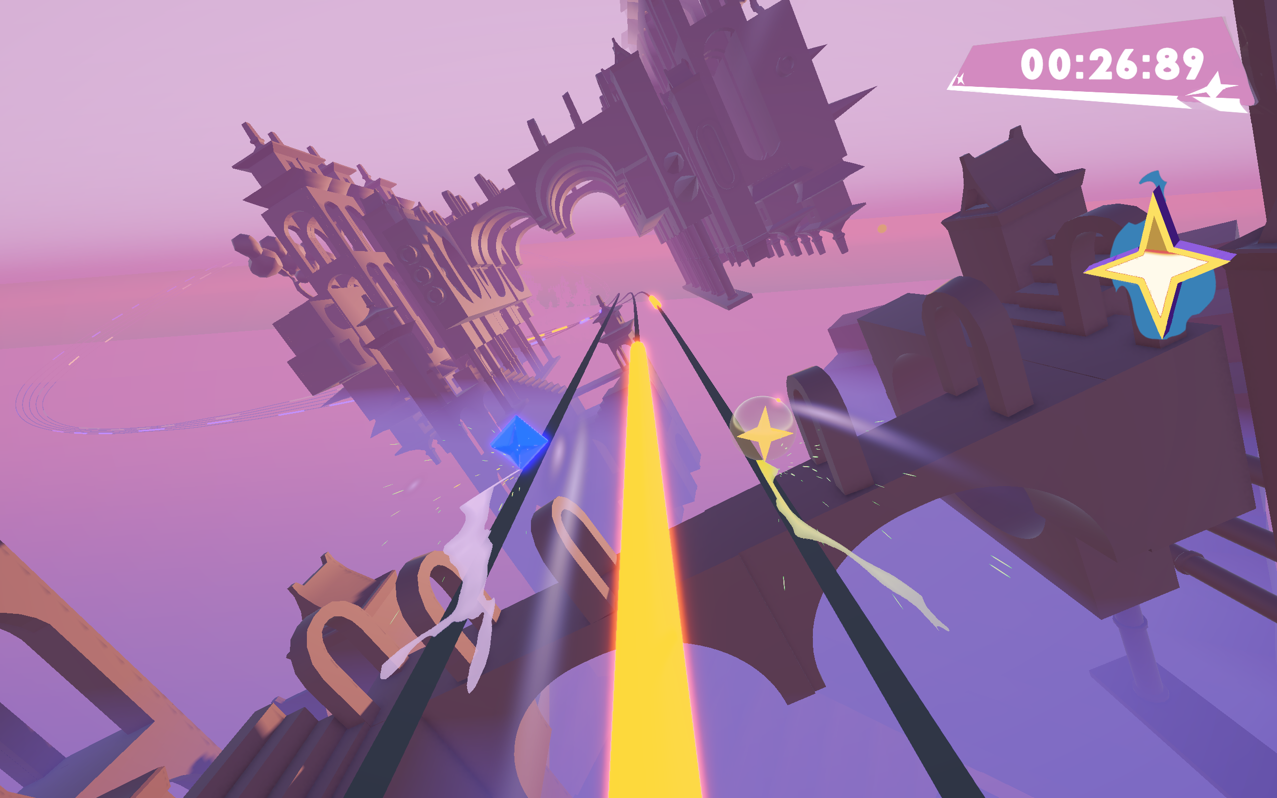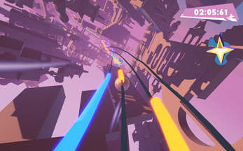In Flying Rhythm, team up as two synced-up entities blasting through a maze of rails. Race to the finish as fast as you can while scooping up Boosts to skyrocket your score.